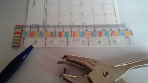Tehát a vonalzó lyukaihoz mértem a Filofax lap lyukait. Nem passzoltak, de sebaj! A lap legfelső lyukához illesztettem a vonalzót úgy, hogy annak is a legfelső lyuka fedje teljesen pontosan. Ilyen módon lesz még egy lyuk, ami passzol, a többit kell csak kilyuaksztani.